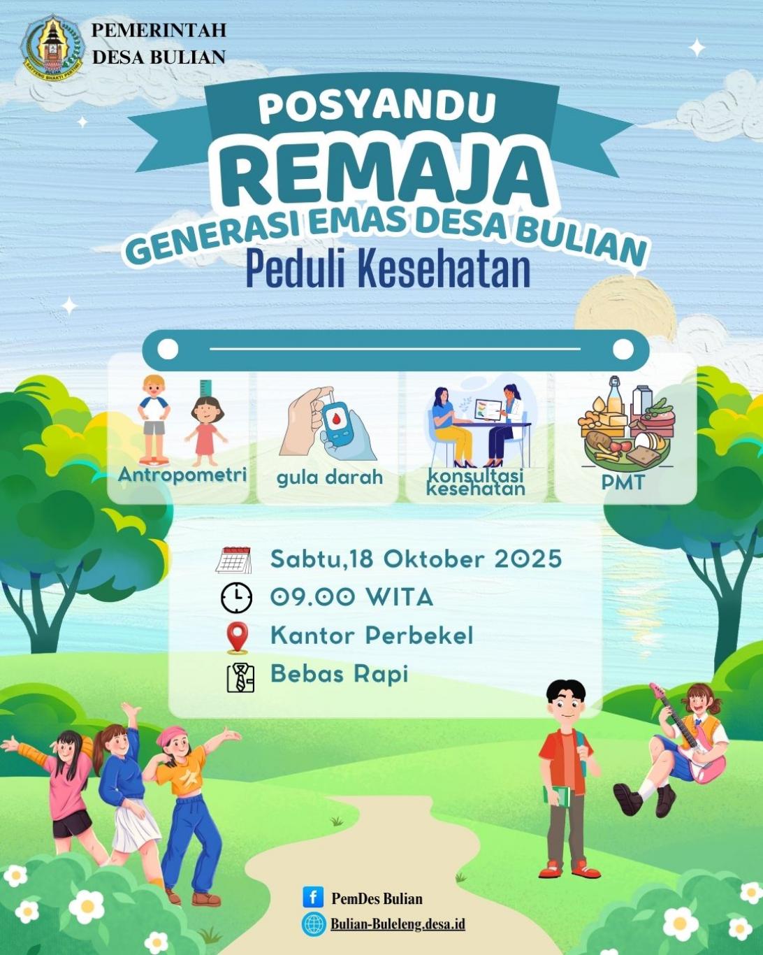 Posyandu Remaja kembali hadir untuk memastikan kamu tumbuh optimal dan tetap fit di segala aktivitas! Ini saatnya kita peduli pada kesehatan diri sendiri.